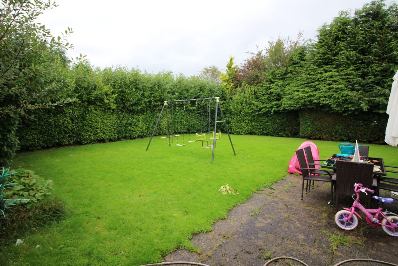 To the rear, the property boasts a generous garden space bordered by landscaped hedging, complemented by practical storage sheds.